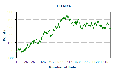 EU-Nice is a specialist Asian handicap football betting service, with additional fixed odds and over/under bets on soccer matches. Tips are sent to members at least 2 hours prior to kick-off and there are roughly 40 tips every month. They also offer a money back guarantee for the following 4 weeks in the event that a month does not return 30 units profit. Bets are generally made with Pinnacle Sports, Bet365 and 188bet. Proofed to Sports-Tipsters from May 2009.